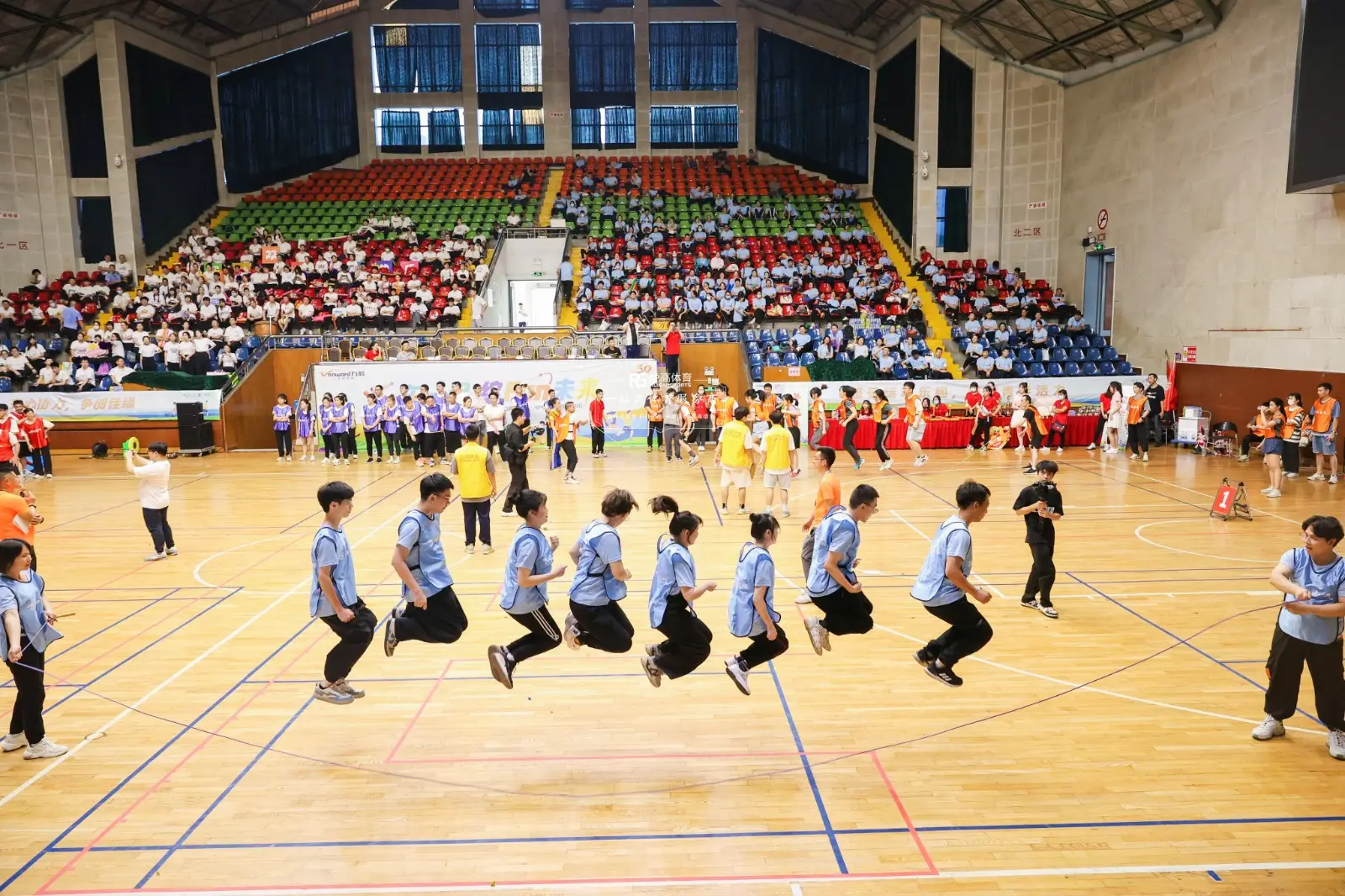 在完成热身运动后,员工分成四个队伍进行了激烈的比拼,各个运动健儿都在运动会中拼搏奋进,勇创佳绩,迸发出的活力与激情点燃了全场,观众席上的呐喊助威也为运动员提神鼓劲不少。